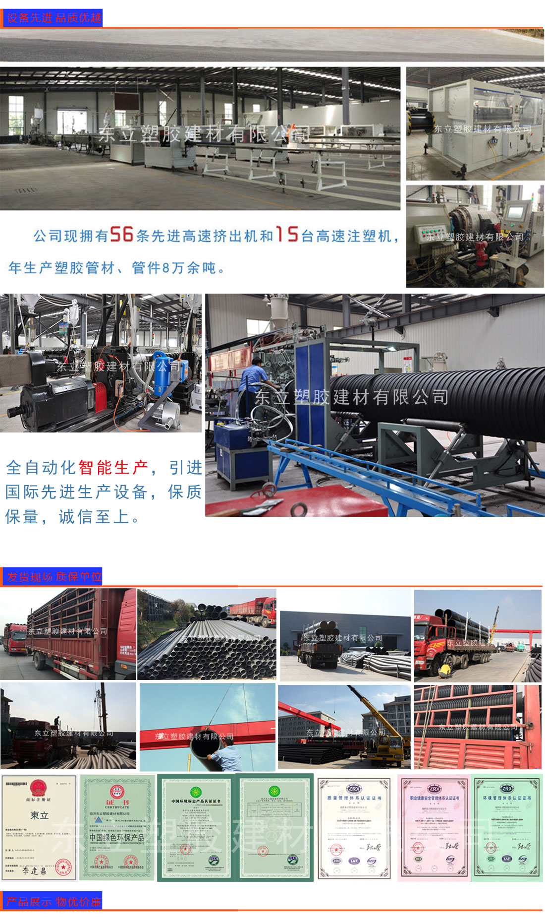 主要生產“東立”品牌塑膠管道,主要產品包括五大系列十六種產品,規格齊全,產能龐大、供貨及時,設備先進、質量穩定,服務優良、滿足客戶的需求。